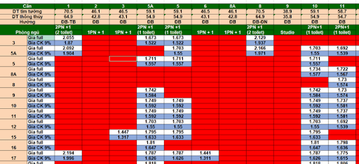| 1 PN +1 WC | 37-43 m2 | Từ 2,1 tỷ | 70 triệu |